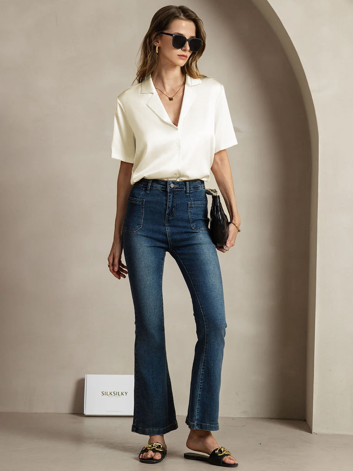 Damesoverhemd van 19 momme zijde met korte mouwen, reverskraag en knoopsluiting