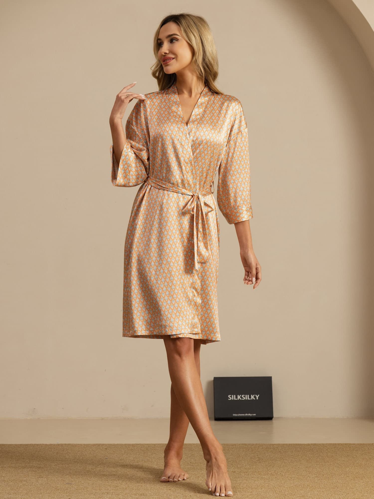 Gemaakt van 100% pure zijde, biedt deze badjas een zachte, ademende en lichte draagervaring voor het hele dagcomfort. Het wikkelontwerp met verstelbare strikriem accentueert de taille, terwijl de kimono-mouwen een ontspannen en elegante uitstraling geven. Met hart-geo patroon zorgt het voor een speelse maar verfijnde look, perfect om te loungen of te slapen. Combinatie van elegantie en comfort maakt deze badjas een tijdloze toevoeging aan iedere garderobe thuis.