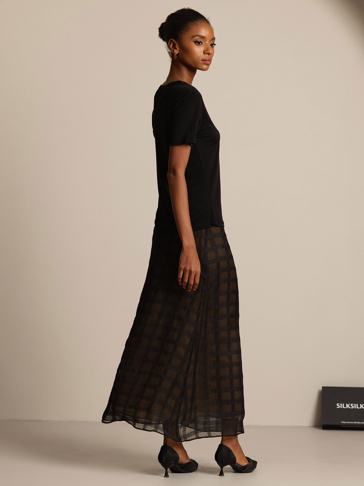 Round-necked silk t-shirt in black is truly elegant and comfortable.